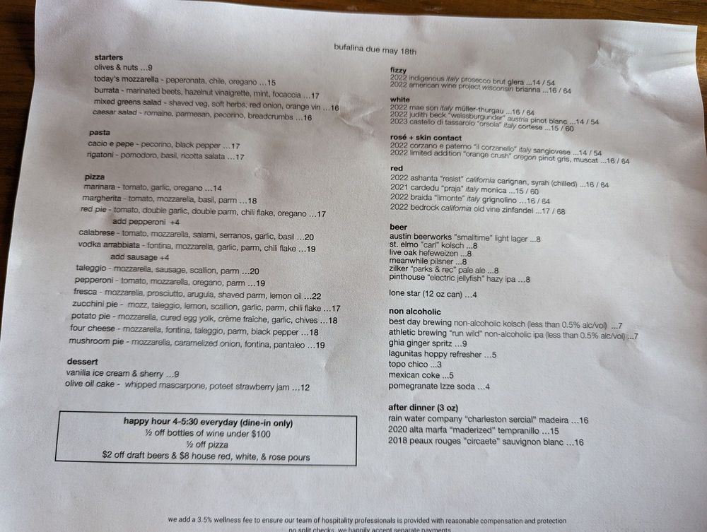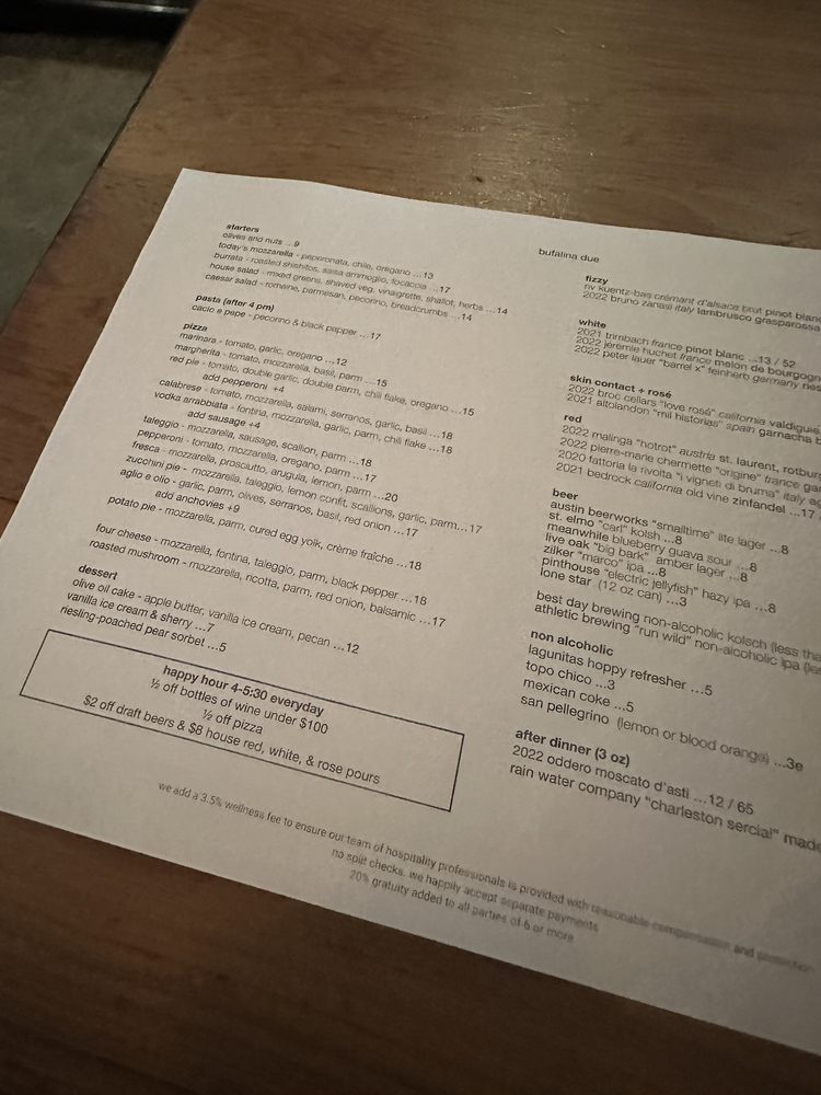 Bufalina Due is a trendy pizzeria located in Austin, TX, offering a variety of delicious pizzas with vegan options available. The menu includes classic options like Margherita and Marinara pizzas, as well as unique creations like the Four Cheese and Calabrese pizzas. Customers have praised the quality of the ingredients and the flavorful toppings on each pizza. The restaurant also offers a great happy hour deal with 1/2 off specialty pizzas and discounted wines. The cozy ambiance and intimate setting make for a pleasant dining experience. Overall, Bufalina Due stands out for its excellent pizzas, friendly service, and inviting atmosphere, making it a must-visit for pizza lovers in the area.